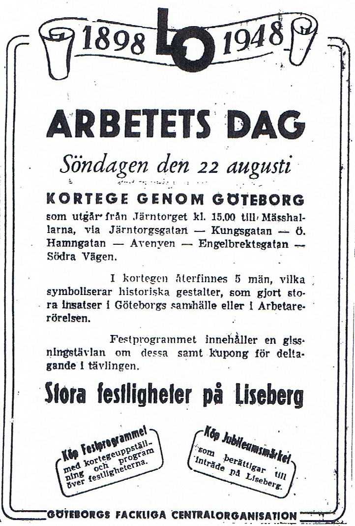 På Göteborgs gator arrangerades femtioårsjubileumet med ett festtåg på temat ”Arbetets dag”, från Järntorget till Svenska Mässan. Göteborgs Fackliga Centralorganisation beställde ett festmärke som visar en muskulös arbetare med bar överkropp och en slägga på axeln. Ett köpt märke berättigade till fri entré på Liseberg, där stora festligheter hölls för att fira LO 50 år. Reklam för arrangemanget gjordes bl.a. i tidningen Ny Tid där en annons var införd om Arbetets dag, söndagen den 22 augusti.