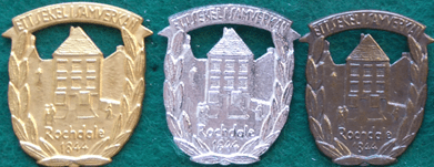 Rochdale 1844, ett sekel i samverkan. Märket togs fram till kooperationens 100 årsjubileum 1944. 1844 startade i Rochdale en av de första kooperativa föreningarna. Kooperation har uppstått på flera olika platser, men ett av de mer kända startade just i Rochdale, då 28 vävare bildade en förening. Man satsade ett pund var, för att sätta upp en livsmedelsbutik, där medlemmarna kunde köpa varor. Efter ett år hade medlemsantalet växt till 74 personer och gett ett överskott på 22 pund. Från början slogs fast att ingen medlem skulle ha mer än en röst, även om han eller hon hade mycket pengar innestående i föreningen.
