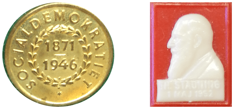 De danska märkena Socialdemokratiet 1871 – 1946, märket utgavs vid 75 års-jubileet 1946, och Första majmärket TH Stauning 1 maj 1952