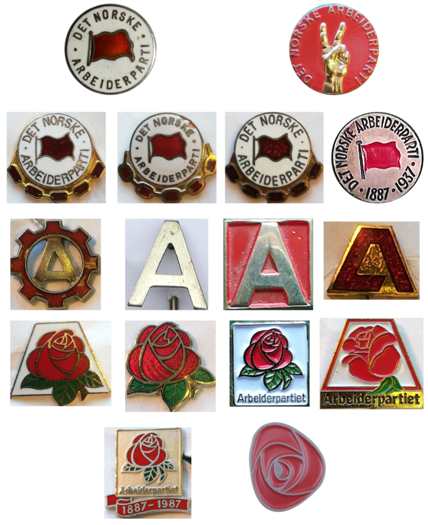 Märke 10 Arbeiderpartiet, märket användes 1972 och samma symbol finns på Första Majmärket 1977.